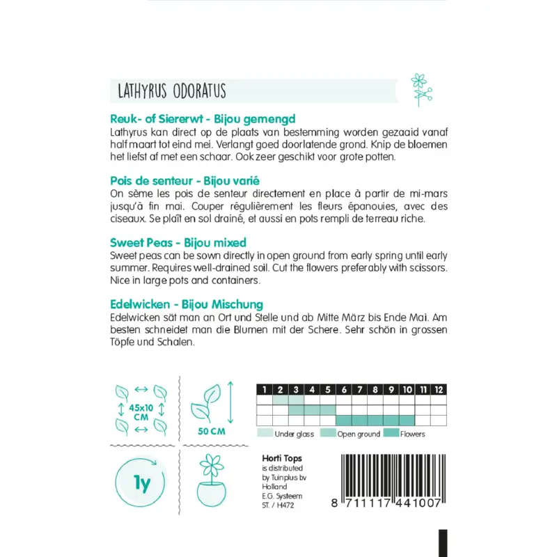 Lathyrus 'Bijou' zaden zaai je binnen van februari - maart. En direct op de plek van bestemming kan vanaf half maart tot eind mei. Zaai op een zonnig plekje in een goed doorlatende grond. De vrolijk gekleurde bloemen knip je het liefst af met een schaar. Hoe meer bloemen je knipt, hoe meer er gaan bloeien. Er zitten 12 zaden per gram in een zakje.