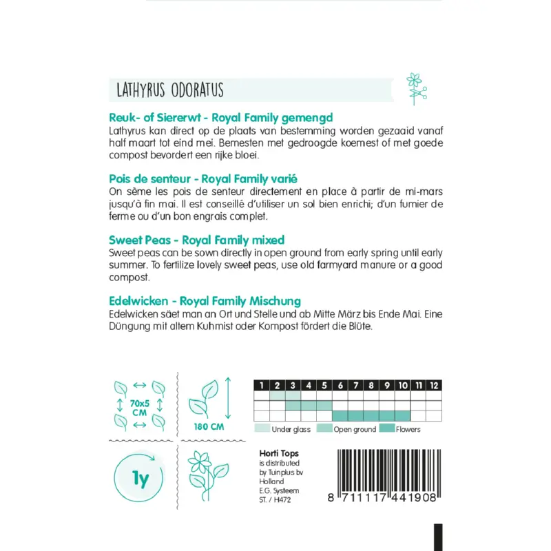 Lathyrus 'Royal Family' zaden zaai je binnen van februari - maart. En direct op de plek van bestemming kan vanaf half maart tot eind mei. Zaai op een zonnig plekje in een goed doorlatende grond. Door te bemesten met gedroogde koemest of goede compost bevorder je een rijke bloei. De vrolijk gekleurde bloemen knip je het liefst af met een schaar. Hoe meer bloemen je knipt, hoe meer er gaan bloeien. Er zitten 12 zaden per gram in een zakje.