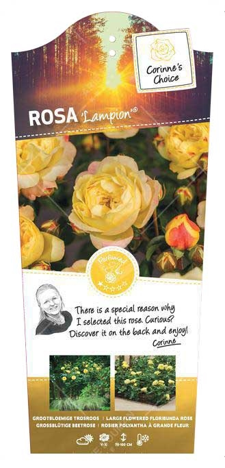 Roos 'Lampion'® is een roos met diep gele bloemen. Een schitterende gele bloem met een rode gloed. bij de randen. De bloemen geuren niet maar daarom blijft het wel een prachtige roos. De bloemen bloeien van mei-oktober en de plant staat het liefst in de zon of halfschaduw. De maximale hoogte van deze roos is ca. 70-100 cm.