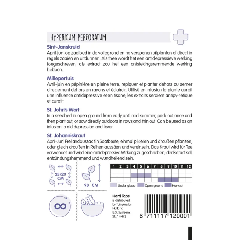 Sint-Janskruid zaden kun je zaaien van april tot juni in de volle grond en na het verspenen uitplanten. Of direct in regels zaaien en uitdunnen. De plantafstand is 25 x 20 cm. Sint-Janskruid kan veel schaduw verdragen. Het is een overblijvende kruidenplant met prachtige gele bloemen die bloeien van augustus tot oktober. Heeft als extract een ontstekingsremmende werking. Om te oogsten kun je de gehele bloeiende plant drogen in de schaduw. Bij strenge vorst dek je de plant af met bladeren. Er zitten ca. 9000 zaden per gram in een zakje.