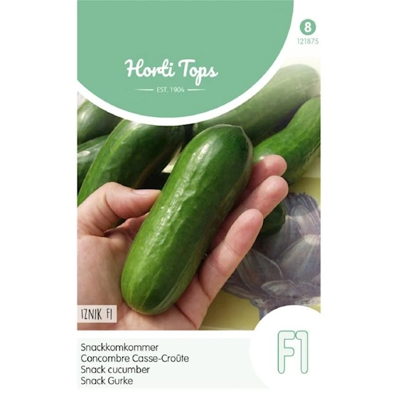 Snackkomkommer 'Iznik F1' zaden zaai je vanaf maart tot juni in potjes bij 22/25°C. Na 4-5 weken in een hobbykasje uitplanten. Plantafstand is 70 x 70 cm. Het is een snackkomkommer die ongeveer 12/14 cm lang wordt. Een vroeg en rijkdragend ras wat geschikt is voor een kas, pot en buitenteelt. Heeft geen bestuiving nodig. Er zitten ca. 40 zaden per gram in een zakje.