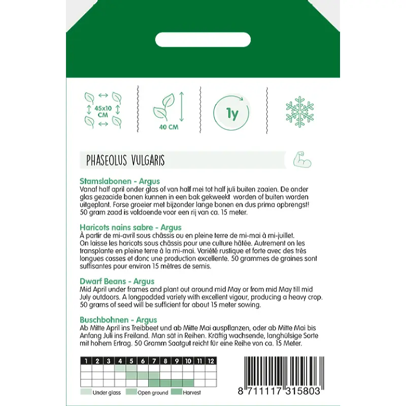 Stamslabonen Haricot Vert 'Argus' zaden zaai je vanaf half april onder glas. Of van half mei tot half juli direct in de vollegrond in regels. De onder glas gezaaide bonen kunnen in een bak gekweekt worden of buiten worden uitgeplant. Houd de grond voldoende vochtig. Plantafstand is 45 x 10 cm. Er zitten ca. 2 zaden per gram in een doosje. 50 gram zaad is voldoende voor een rij van ca. 15 meter. Het is een forse groeier met een prima oogst.