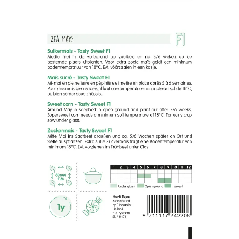 HT Suikermais 'Tasty Sweet F1' zaden zaai je vanaf half mei in de vollegrond op een zaaibed. Ongeveer 5/6 weken later uitplanten op de juiste plek. Eventueel voorzaaien in een kasje. Plantafstand is 80 x 40 cm. Er zitten ca. 5 zaden per gram in een zakje. Wil je extra zoete mais, dan zaai je bij een bodemtemperatuur van 18°C. Het is een F1 hybride ras.