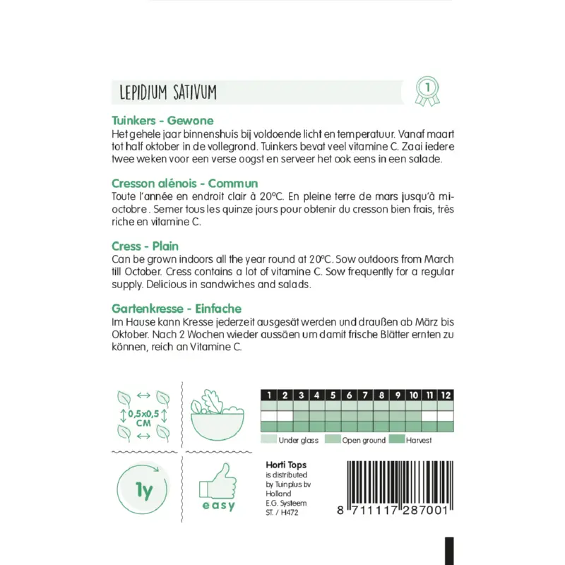 Gewone Tuinkers is een snelkiemend gewasje met een fris-pittige smaak. Erg leuk om samen met je kinderen te zaaien en eten.