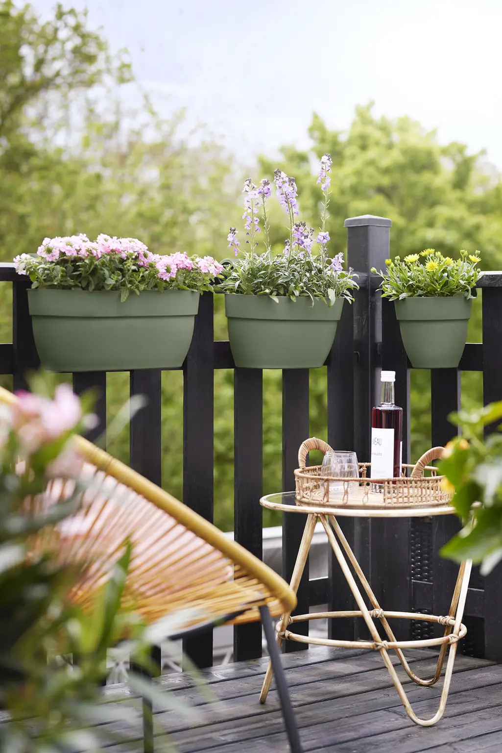 Vul de pisctache groene Vibia Campana Easy Hanger met mooie planten en hang de balkonbak eenvoudig aan de reling van je balkon.