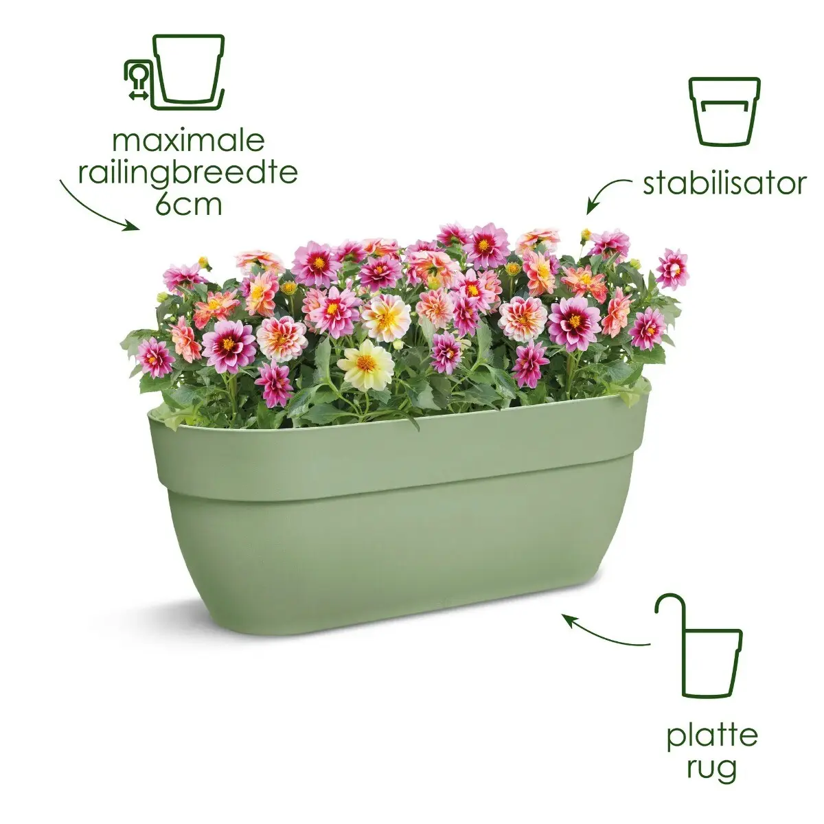 Je kunt deze ovalen balkonbak heel eenvoudig installeren door aan een balkonreling te hangen die tot 6,5 cm breed is. De achterkant van de bloembak is vlak waardoor deze stevig op de plek blijft hangen. De balkonbak heeft een slimme waterafvoer dankzij overlooppijpjes en is bestand tegen alle weersomstandigheden. Verkleurt niet en is gemakkelijk schoon te maken.