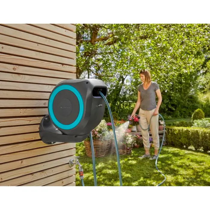 Maak de tuin bewateren gemakkelijk door een wandslangenbox van Gardena te gebruiken.