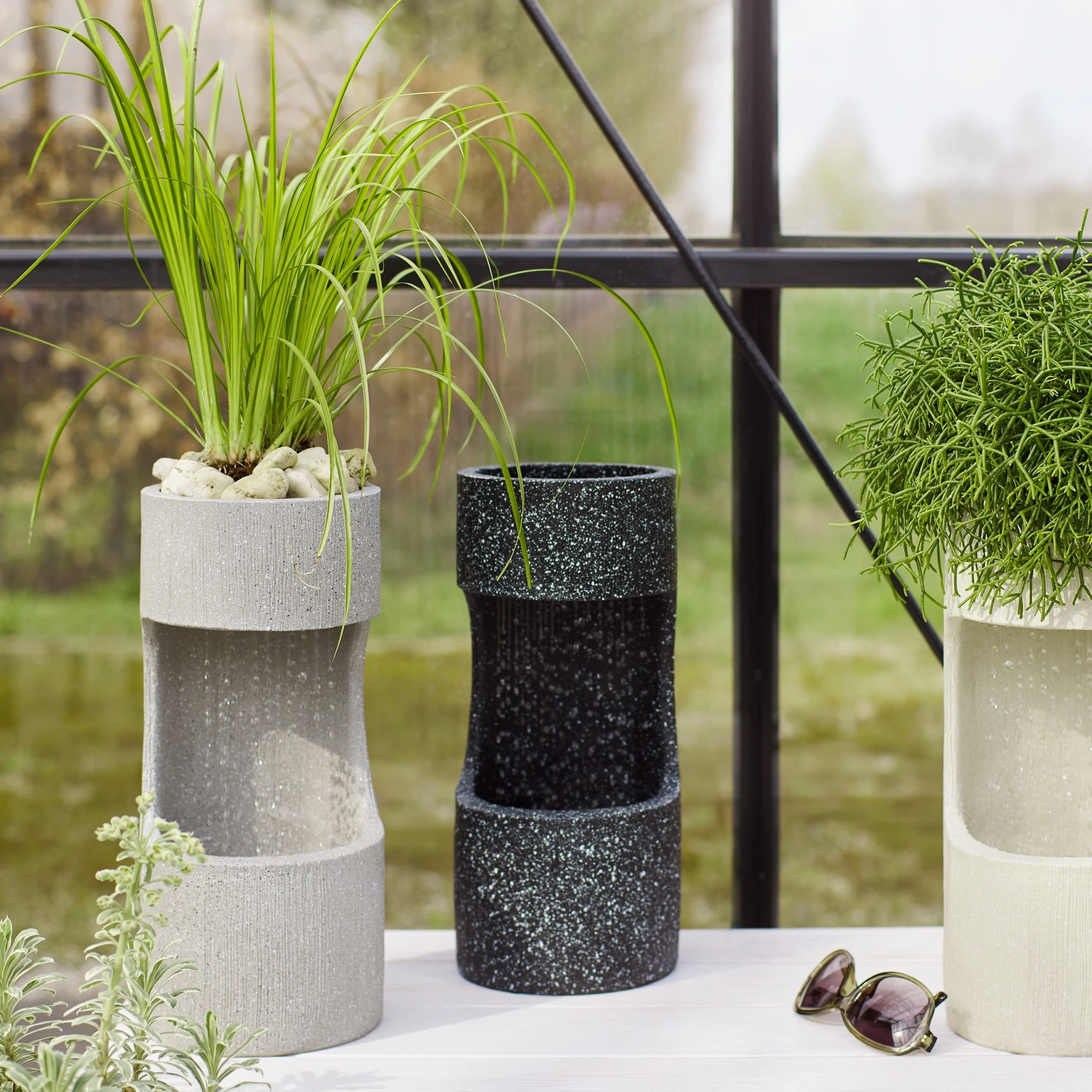 De zwarte cilindervormige fontein heeft bovenop een geïntegreerde bloempot waar je een plant in kunt zetten. Zo creëer je nog meer sfeer in huis of in de tuin.