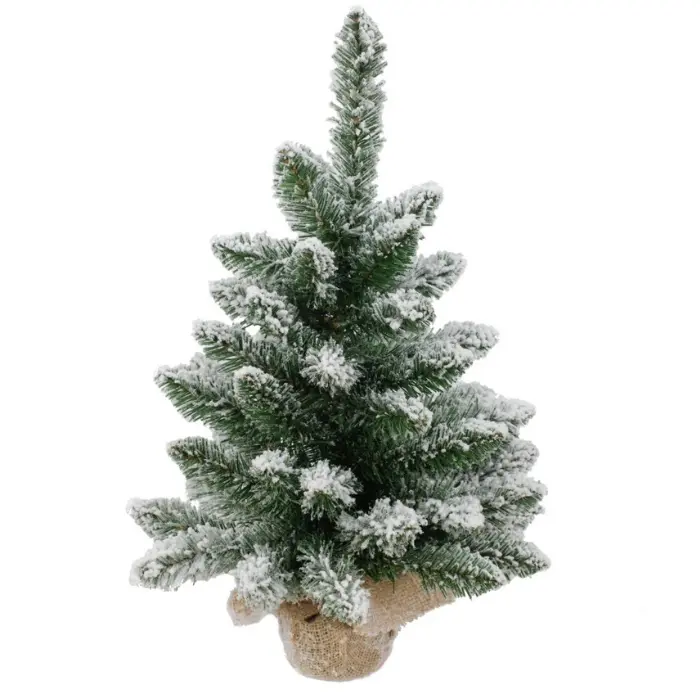 Om de voet van deze leuke, kleine kunstkerstboom Whistler White Flocked zit jute heen. En er ligt een dun laagje sneeuw op de takken.