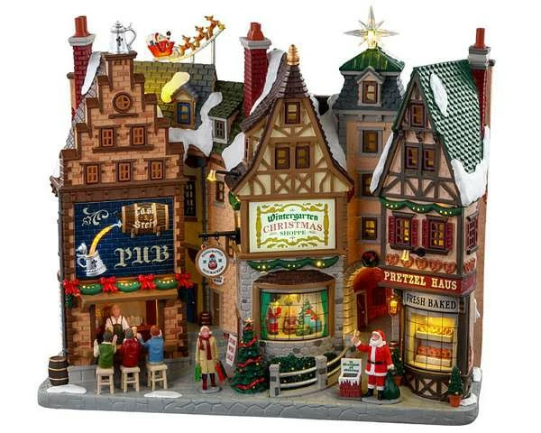 Wintergarten Lane is al een gezellig dorpje op zich. Winkeltjes, een pub of een pretzel winkel, je vindt het allemaal in Wintergarten Lane. De kerstman luidt de bel en aan de bar hangen verschillende mensen. Op het dak zie je nog een kerstman in zijn arreslee met rendieren ervoor. Via een trappetjes kun je tussen de huizen door lopen. Sfeervolle kerstverlichting maakt dit dorpje compleet. Werkt op 3x AA-batterijen (exclusief) en heeft een aan/uit-schakelaar. Kan op een adapter (exclusief) aangesloten worden.