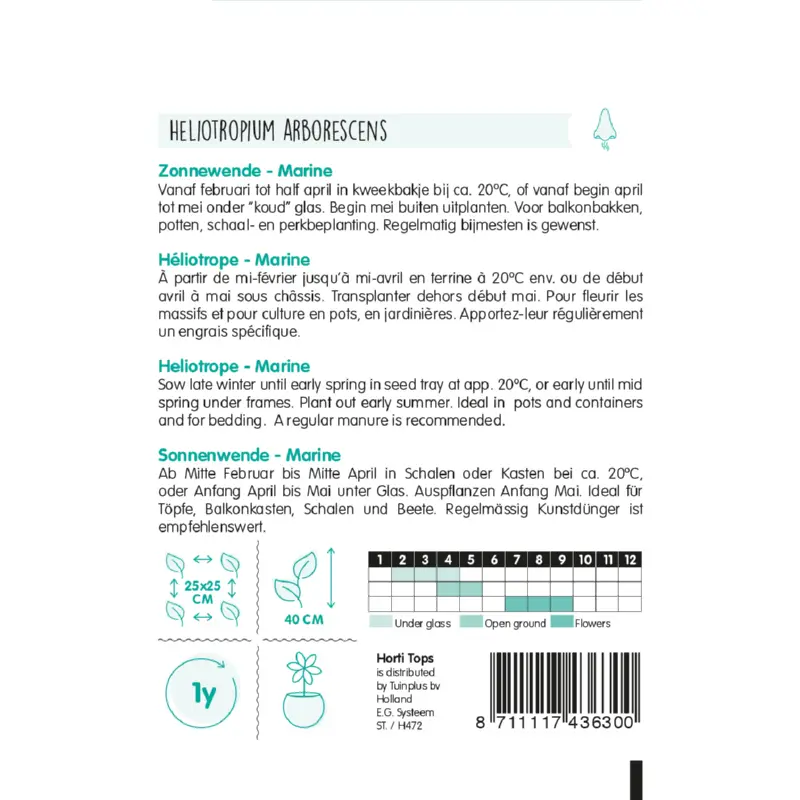 Heliotropium (Zonnewende) zaden kun je van februari tot half april zaaien in een kweekbakje bij ca. 20°C. Of vanaf begin april tot mei onder 'koud' glas. Begin mei buiten uitplanten. Plantafstand is 25 x 25 cm. Regelmatig bijmesten. Er zitten ca. 1500 zaden per gram in een zakje.